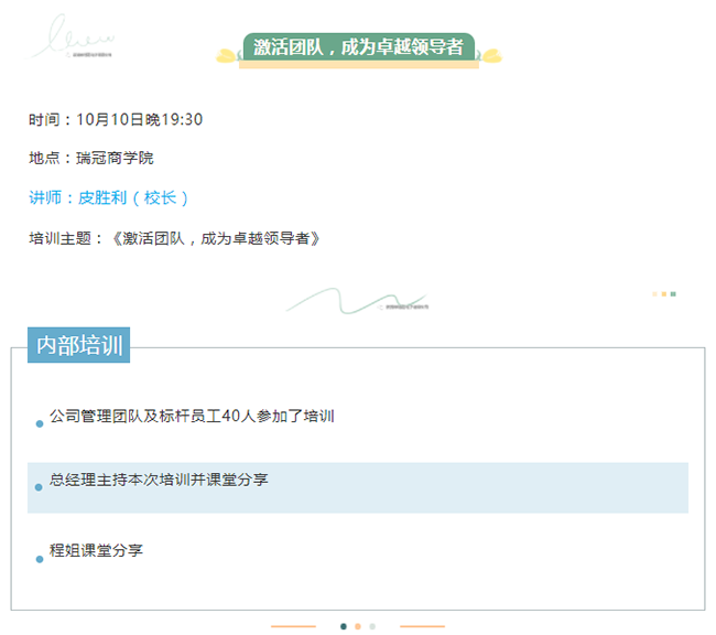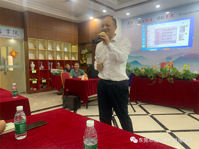 总经理在主持培训时强调:公司为大家的晋升和未来搭建知识平台,董事长从万忙中抽时间亲自为大家授课,这是给大家最大的福利,当今社会,企业不学习就无法生存,员工不学习就会被淘汰,希望大家珍惜在瑞冠工作的机会,做到工学结合、学以致用。